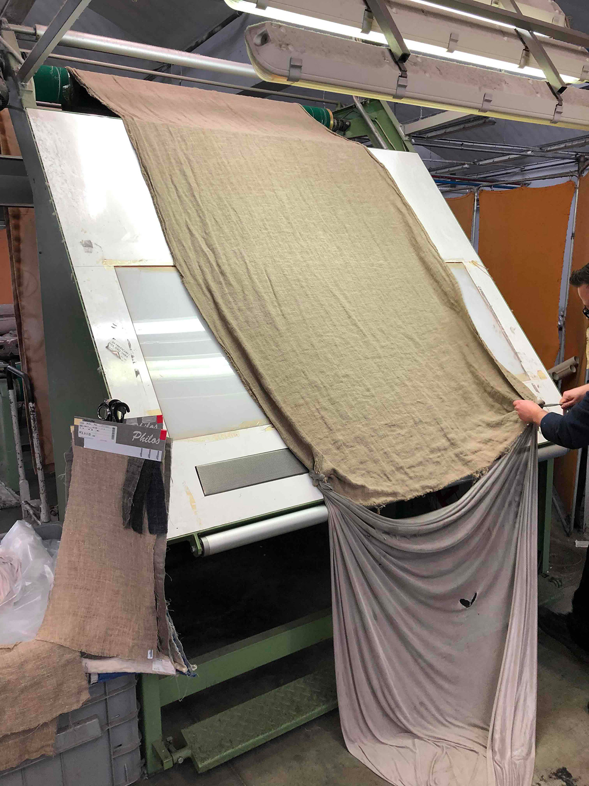 生地を織った後、その加工方法に関してイタリアの工芸的染色技術である低温染めが色の表現も含めて特徴的だと思う。